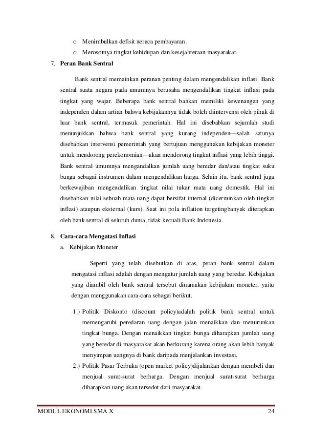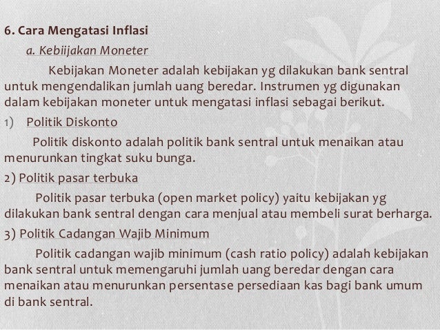 Kebijakan untuk mengatasi inflasi dengan cara menurunkan tingkat suku bunga bank disebut. Jika diskonto naik, biaya peminjaman dari bank indonesia semakin tinggi sehingga keinginan bank umum untuk meminjam dana akan berkurang. Merupakan instrumen dengan menaikkan atau menurunkan cadangan kas.