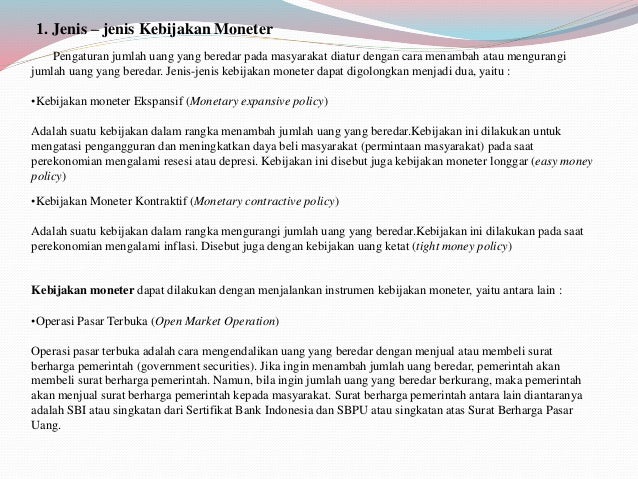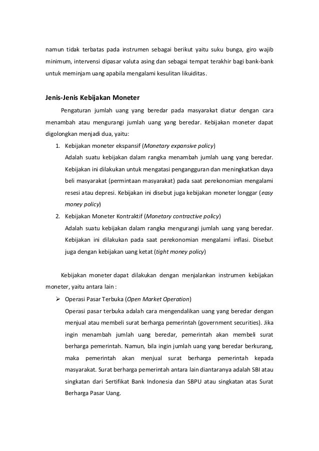 Merupakan instrumen kebijakan moneter dengan 5c yaitu character, capability, collateral, capital, and. Kebijakan moneter ekspansif yang dilakukan bank sentral umumnya melalui operasi pasar terbuka, persyaratan cadangan bank dan penetapan suku bunga. Kebijakan operasi pasar terbuka melalui.