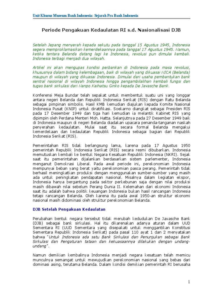Pada tanggal 15 desember 1951, diumumkan uu no. Silakan baca artikel mengintip de javasche bank (bank indonesia) muaro padang dari zaman ke zaman ini selengkapnya di jelajah nagari awak [butuh rujukan] pada masa itu de javasche bank, nv didirikan di batavia pada tanggal 24 januari 1828 kemudian menyusul nederlandsche indische escompto maatschappij, nv pada tahun 1918 sebagai pemegang monopoli pembelian hasil bumi dalam negeri dan penjualan ke luar negeri serta terdapat beberapa bank yang.